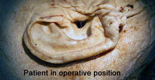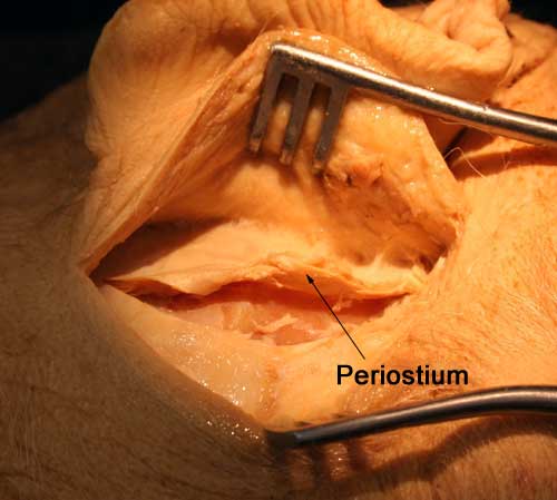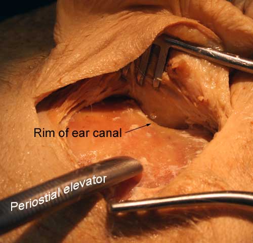 As you dissect down through the skin, and the post auricular muscles you will come to a fibrous layer (periostium) which you should follow forward and expose your area. If you need a temporalis fascia graft you can collect it at this point from the superior end of the incision (I will cover this in the endaural incision guide). Keeping the periostial plane can be useful at the end when suturing this back as it ensures the ear returns to its correct position. Extend this flap forwards until you near the ear canal. Put your finger in the canal to make sure you don’t injury it and you know how far you have to go.