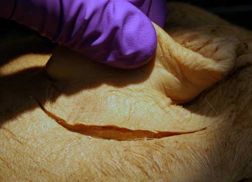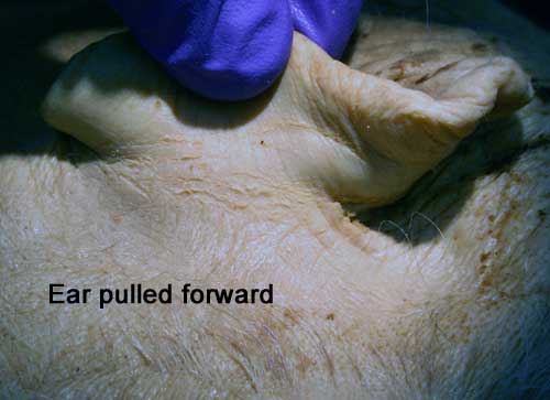 Feel this bone on yourself to give you an idea where it is. The idea is to make an incision that follows this bone down near the tip and gently curves around the posterior ear crease. Don’t allow your incision to go into the post auricular crease as that will be: