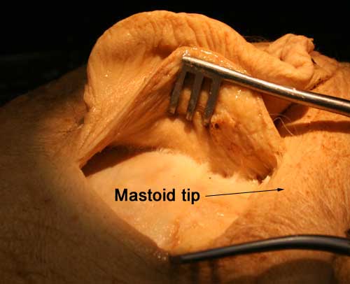 You need to expose the mastoid tip, the temporal line, the root of the zygoma, the posterior lip of the external ear canal and the rest of the mastoid bone. Use a periostial elevator to scratch the periostium off to leave the bone as clean as possible. At this point you will normally see most of the landmarks needed to continue.