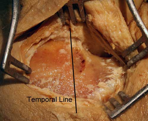 The spine of Henle is a small out crop of bone just within the ear canal at the inferior posterior corner. This roughly marks the spot deep to which the mastoid antrum will be found. Sadly this is not visible on the image below. The temporal line is a small ridge of bone that is the continuation of the zygomatic arch as it attaches just above the ear canal. This line is the attachment of the temporalis muscle and also the level of the dura in the middle fossa of the brain. We clearly need to stay inferior to this and not breach this layer as it will cause a CSF leak.