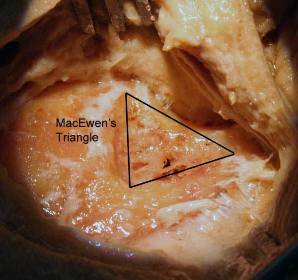 You should have a ‘V’ shape now which when the free ends are joined marks out MacEwans triangle which helps you stay within the mastoid cavity.