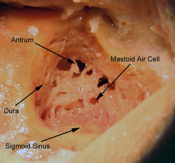 - The sigmoid sinus is located in the posterior border of the mastoid cavity. Drilling into this will obviously cause a terrible bleed and must be avoided. The sinus bulges out of the posterior wall and looks slightly blue when you drill near it. This explains the reason you need to irrigate well as you drill so you can see these subtle signs as you work.