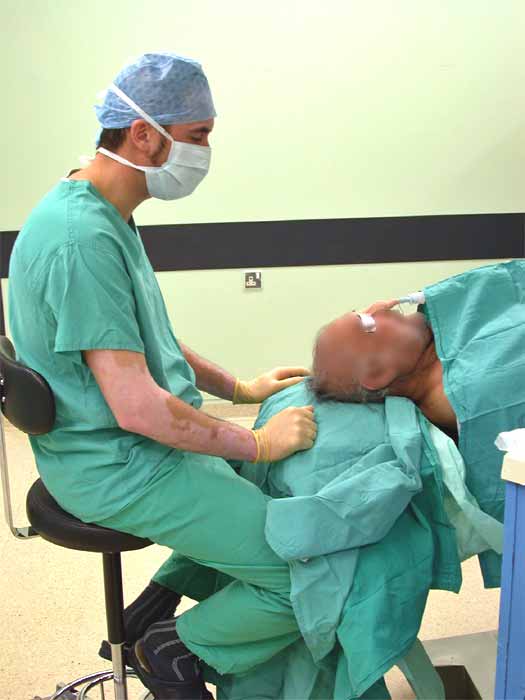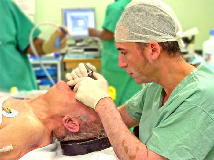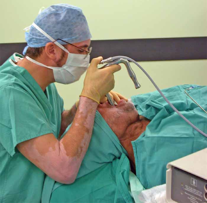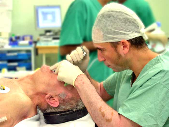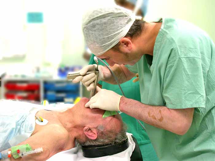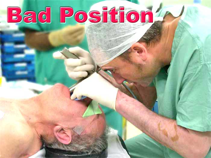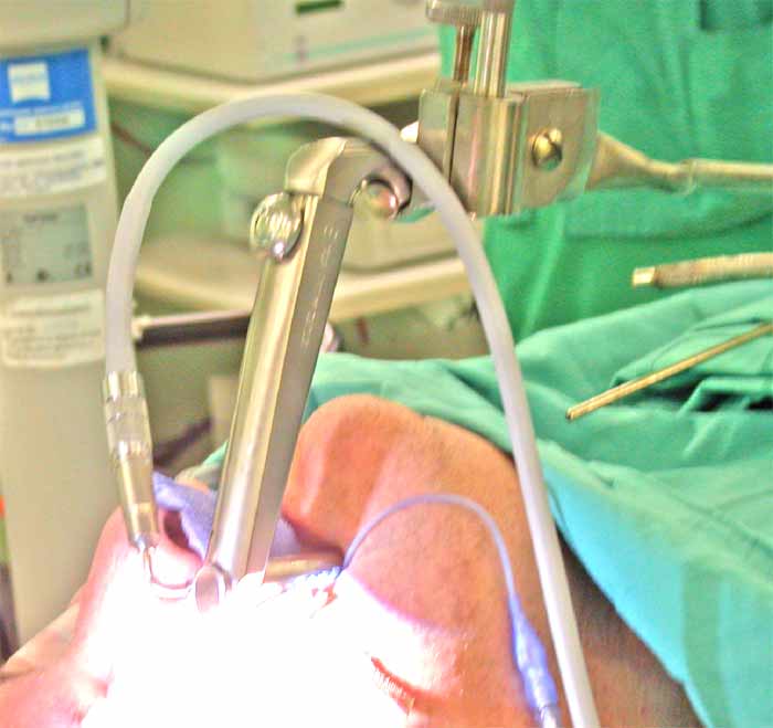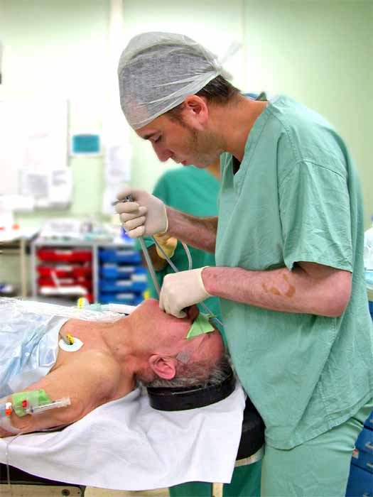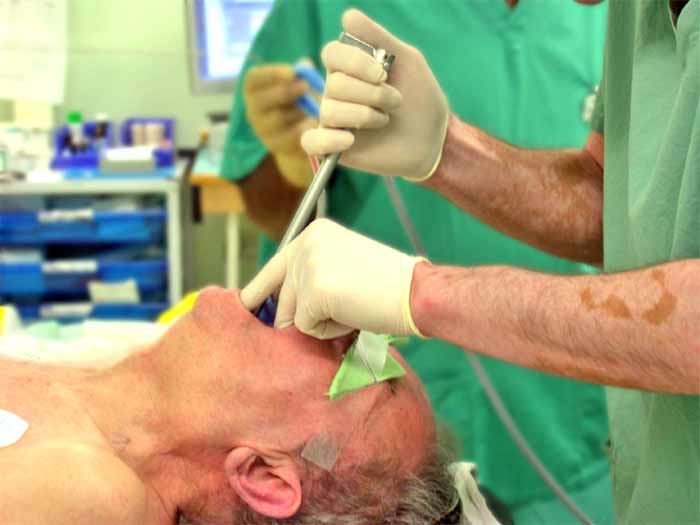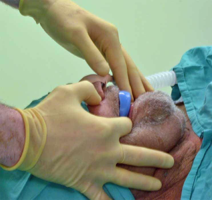 Always use a mouth guard to give some protection against damaging the teeth. Some people always place their little finger between the scope and the teeth. The idea being that when it is too painful for your finger then it is probably too much pressure for the teeth. If the patient doesn’t have any teeth use gauze to protect the gums.